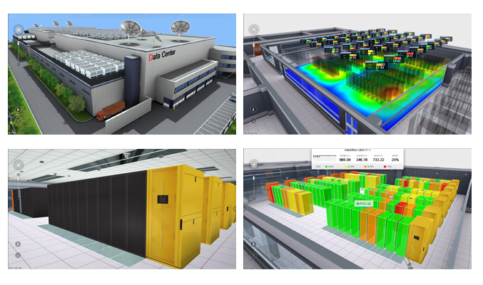 1、環(huán)境可視化:數據中心所在的環(huán)境三維可視,包括園區、建筑、樓層、機房、設備、機柜的3D仿真分級展現。