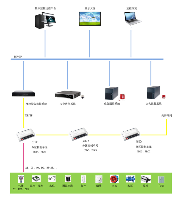 監控內容包括:供配電系統、空調系統、新風(fēng)系統、消防系統、照明系統、溫濕度、氧氣、甲烷、硫化氫、水位等,并可與視頻系統、門(mén)禁系統等系統集成。