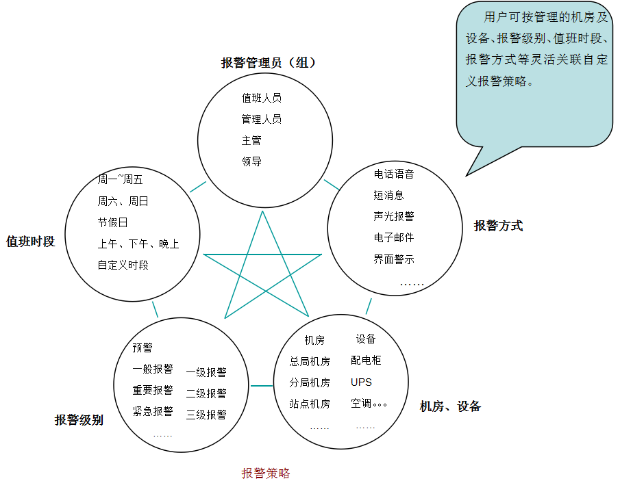 系統具有完備的報警功能和靈活的報警策略,用戶(hù)可自定義報警方式和報警策略。報警方式包括界面警示、聲音聲光、電話(huà)手機、短信、電子郵件等,報警事件可設置多種報警方式,不同的設備報警可以報告給不同的管理人員,并可結合值班時(shí)段或節假日安排報告給相應的值班人員。
